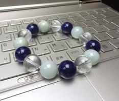 14mm玉本翡翠4個&ラピスラズリ5個&透明本水晶5個ブレスレット(シリコンワイヤー 腕サイズ15.1~16.5cm用) 【S】